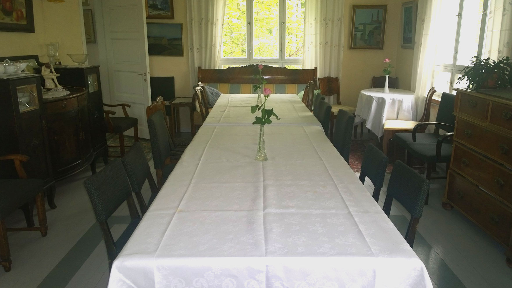 Matkasessa on viihtyisä sali ja ruokailuhuone, jonne voi kätevästi kattaa noutopöydän. Ikkunoista avautuu näkymä vanhaan omenapuutarhaan ja Joutjärvelle. Kesäisin ja sään salliessa puutarha ja lasiveranta tarjoavat lisätilaa.